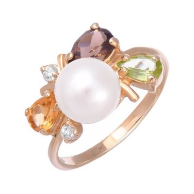 Золотое кольцо с жемчугом и хризолитом с цитрином и раухтопазом 585*Золотой