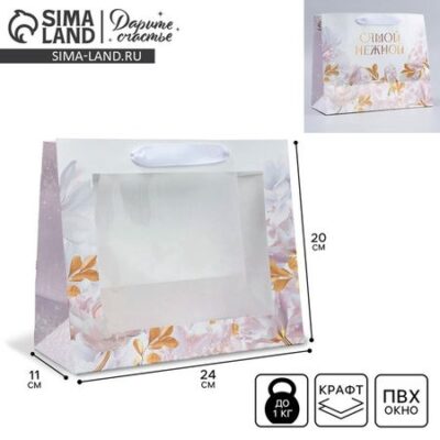 Пакет подарочный крафтовый с пластиковым окном, упаковка, «Самой нежной», 24 х 20 х 11 см Дарите Счастье