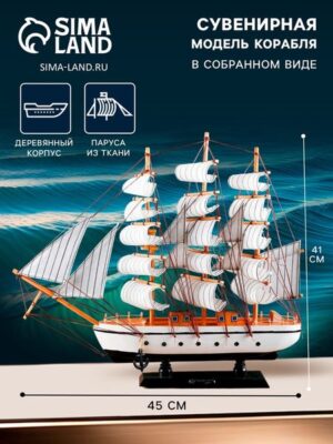 Сувенирная модель корабля с белыми парусами и бортами станет отличным подарком и декоративным элементом для любого интерьера. Она объединяет в себе изящество