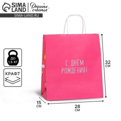 Пакет подарочный крафтовый, упаковка, «С днём рождения», 28 х 32 х 15 см Дарите Счастье