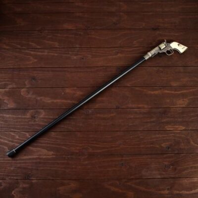 Эта стильная трость с револьверным набалдашником станет отличным подарком для ценителей оригинальных аксессуаров. С высотой 93 см и элегантным золотистым