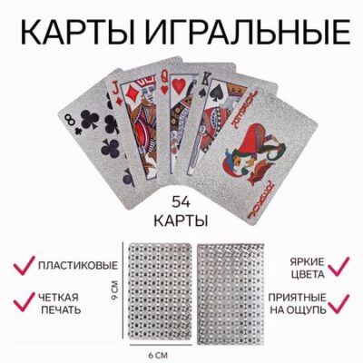 ОсобенностиВ колоде 54 карты.Размер карты: 9 × 6 см.Карты изготовлены из пластика.