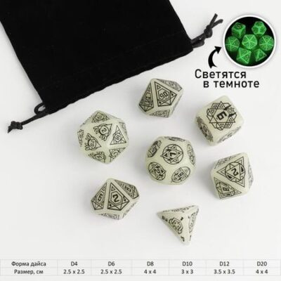 Дайс: 4 грани, 6 грамм.Дайс: 6 граней, 18 грамм.Дайс: 8 граней, 16 грамм.Дайс: 10 граней, 14 грамм.Дайс: 12 граней, 24 грамма.Дайс: 20 граней, 27 грамм.