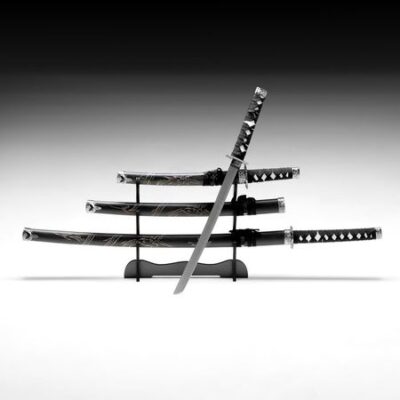Подарочный набор с тремя стильными катанами станет отличным выбором для тех, кто ценит восточную культуру и уникальные элементы декора. Эти макеты, выполненные