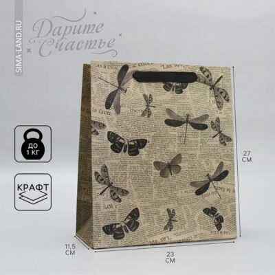 Пакет подарочный крафтовый, упаковка, «Бабочки», 23 х 27 х 11.5 см Дарите Счастье