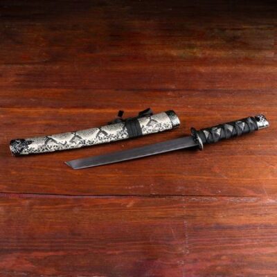 Подарите себе или своим близким уникальный элемент декора — это элегантная сувенирная катана на подставке. С длиной лезвия 19 см и бежевыми ножнами, оформленными
