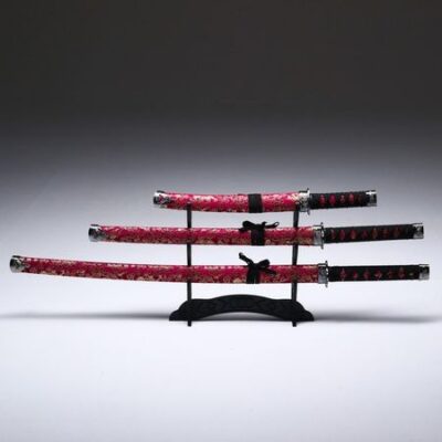 Погрузитесь в атмосферу восточной культуры с великолепным подарочным набором сувенирных катан на подставке, украшенных драконами на бордовом фоне.