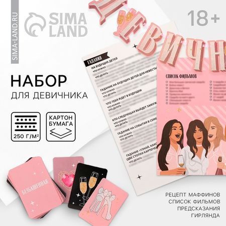 Устройте самый веселый, яркий и неповторимый праздник для невесты, который останется в памяти надолго. Набор для проведения девичника идеален для домашней вечеринки. Эта игра поможет отметить его весело, душевно и незабываемо. Подготовьте для каждой участницы любимые напитки и прекрасное настроение! Игра предусмотрена на любое количество участниц. Сценарий включает в себя 6 разнообразных гаданий с атрибутами для их проведения, также в наборе вы найдёте праздничную гирлянду на ленте «Девичник», список фильмов на вечер, рецепт маффинов, который в дальнейшем вы занесёте в свою кулинарную книгу.Размеры гирлянды:»Д»- 10,8Х15,7 см;»Е»- 12,4Х14,5 см;»В»- 7,9Х13,7 см;»И»- 9,4Х15,2 см;»Ч»- 8,6Х13,8 см;»Н»- 12,5Х14,4 см;»И»- 8,3Х13,7 см;»К»- 11,8Х14,8 см.