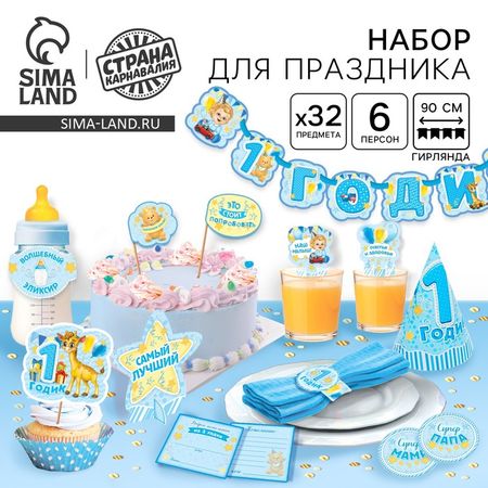 Замечательного вам праздника! В наборе для проведения праздника «1 годик» вы найдёте всё, что нужно для незабываемого детского дня рождения. В набор входят: маркер на бокал — 6 шт.; кольцо для салфеток — 6 шт.; наклейка-значок для гостей — 6 шт.; наклейки-значки для мамы и папы — 2 шт.; фигурка на стол — 3 шт.; украшение в торт — 3 шт.; листочки для пожеланий — 8 шт.; конверт; украшение на бутылку; праздничный колпачок; гирлянда (105 см); сценарий проведения праздника. С помощью вложенных изделий вы украсите место проведения вечеринки, стол и угощение. Прикрепите гирлянду к стене или дверному проёму на кнопки или клейкую ленту. Её красочные элементы нанизаны на ленту, расстояние между ними регулируется. Аксессуары для оформления стола создадут неповторимую атмосферу праздника. Наклейки украсят одежду гостей и будут здорово смотреться на фотографиях с чудесного торжества. А уникальный сценарий поможет провести мероприятие весело и задорно! Оригинальный праздничный набор с эксклюзивным дизайном размещается в пакете с яркой подложкой.