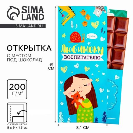 Открытка с местом под шоколадку, станет прекрасным подарком к празднику. Яркий дизайн, удобный формат и приятные эмоции обеспечены своему получателю.Плотность, г/м²: 200;Размер закрытой открытки: 19 см х 8.1 см;Размер кармана: 8 см х 9 см х 1.5см;Материал: картон;Вид товара: открытка.