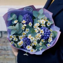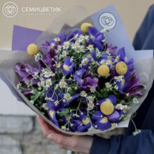 Букет из ирисов, матрикарии и альстромерии в упаковке
