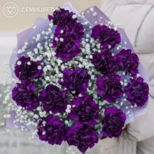 Необычный букет из 15 фиолетовых гвоздик с гипсофилой