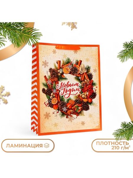 Пакет подарочный новогодний ламинированный вертикальный «Венок угощений», L 31×40×11.5 см