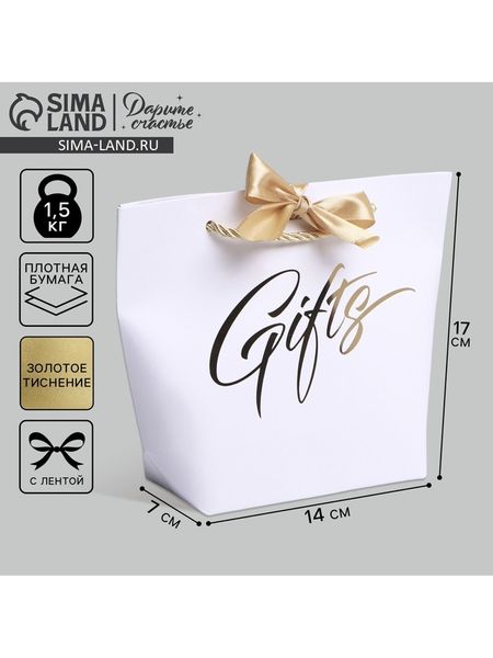 Главная » Подарки,сувениры,цветы Пакет подарочный, упаковка, «Gifts», 14 х 17 х 7 см Просмотров 10 -Перед тем, как раскрыть пакет, посмотрите видео-инструкцию в карточке товара под первым видео -Размеры пакета в сложенном виде: 21 х 17 х 7 см Дарите Счастье