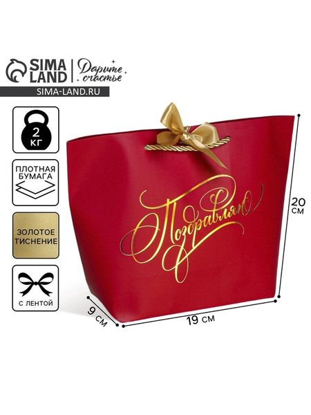 Главная » Подарки,сувениры,цветы Пакет подарочный, упаковка, «Поздравляю», 19 х 20 х 9 см Просмотров 8 -Перед тем, как раскрыть пакет, посмотрите видео-инструкцию в карточке товара под первым видео -Размеры пакета в сложенном виде: 28 х 20 х 9 см Дарите Счастье