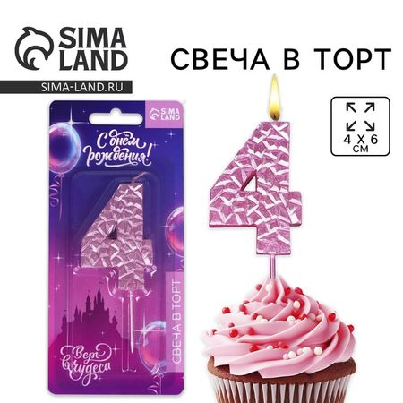 Свеча для торта, цифра «4», розовая, 10 х 4 см