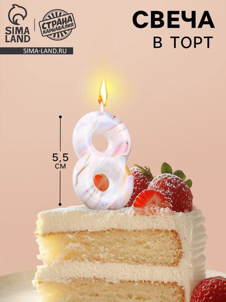 Свеча в торт «Белый мрамор», цифра 8, 5.5 см