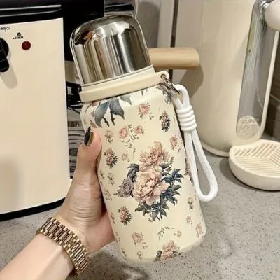 1 шт. Милая цветочная термобутылка из нержавеющей стали с крышкой — Непротекаемая, портативная кружка для путешествий на открытом воздухе, кемпинга, пеших походов — Дорожная бутылка для воды Peony-600ml