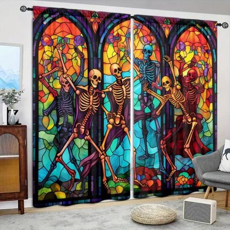 2 шт. 3D витражная занавеска с принтом скелета, пейзажная занавеска с принтом, декор на Хэллоуин, подходит для гостиной, спальни, кухни 50W160H(CM)x2PanelGrommet Top