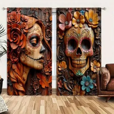 2 шт. Деревянные резные занавески с изображением скелета и любви для домашнего декора на Хэллоуин — оконные карманы для спальни, офиса 52.5cmX116cm X 2pcs