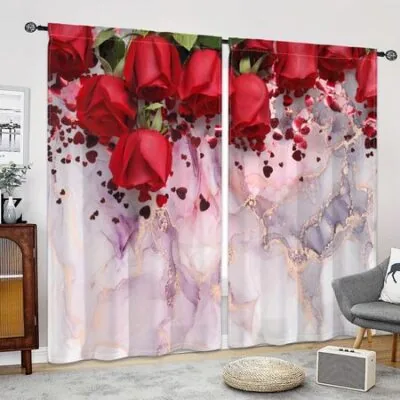 2 шт., Красивые красные розы, защита конфиденциальности, занавеска для гостиной, романтическая мечта, креативное украшение, полупрозрачная занавеска для спальни W65X60H(cm)X2PcsGrommet Top