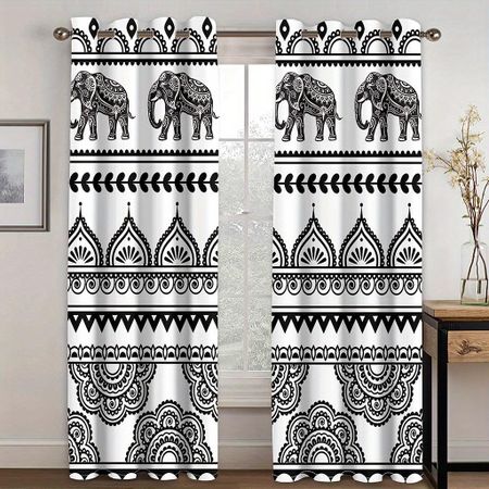 2 шт. Шторы в стиле бохо, шторы на окна в стиле бохо-хиппи с рисунком мандалы и животных-слонов для спальни и гостиной W65X60H(cm)X2PcsGrommet Top