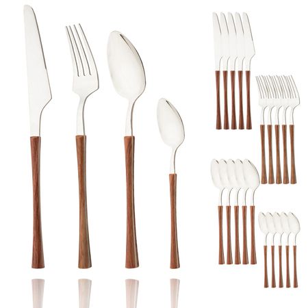 Главная » Все для дома 24 шт., посуда с деревянной ручкой, домашний кухонный набор столовой посуды, нож, вилка, ложка, чайная ложка, имитация мрамора, зеркало из нержавеющей стали, сервис на 6 шт. коричневый/серебряный Просмотров 11 JANKNG HOME