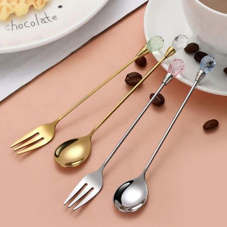 2pcs Multi-purpose Stirring Spoon Long Handle Coffee Spoon Exquisite Crystal Teaspoon Cake silver-fork-pink diamond
