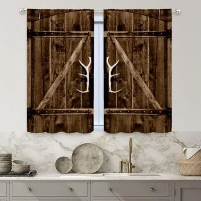 2pcs Nostalgic vicissitudes of yellow wood doors, Study Room Kitchen Living Room Dorm Room Rod Pocket Top Window Drapes, Bedroom W30H65inchW75H166cm