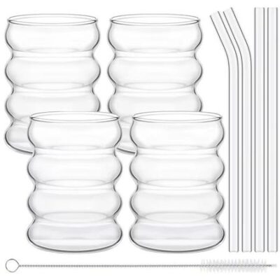 4 шт. креативные стеклянные чашки, кружка для кофе, прозрачные стаканы для питья, ребристая стеклянная посуда, чашки с трубочками, набор для коктейлей и фруктов, стеклянная посуда для напитков 300ml
