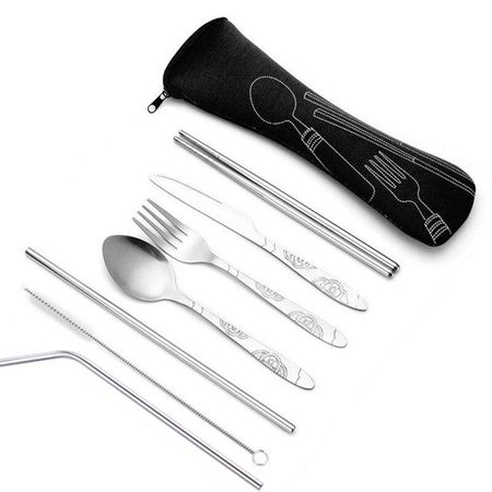 7 шт./компл. набор посуды из нержавеющей стали, портативная тканевая сумка для улицы, нож, вилка, ложка, палочки для еды, соломенные цветы, семь наборов чёрный