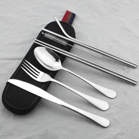 8 шт./компл. набор столовой посуды, портативный набор столовых приборов для путешествий, нож, вилка, ложка, обеденный набор, посуда из нержавеющей стали 18/10, столовое серебро с сумкой серебряный