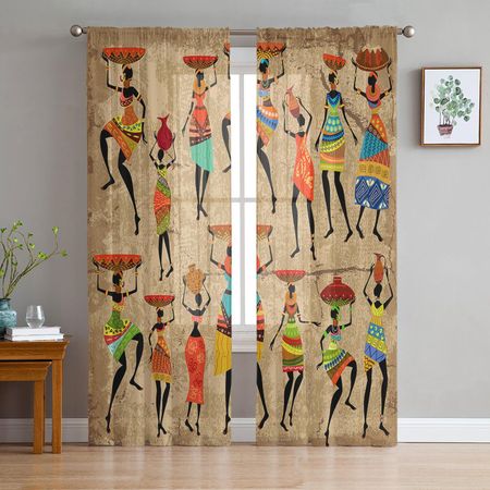 African Women Ethnic White Sheer Curtains for Living Room Decoration Window Curtains for Kitchen Tulle Voile Organza Curtains W135 x H115cm x1Grommet Top