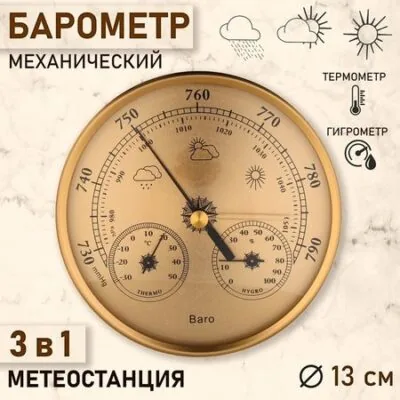 Барометр — прибор для измерения атмосферного давления.Выполнен из металла и пластика, механическая работа.3 В 1!Измеряет:ТемпературуВлажностьАтмосферное давление