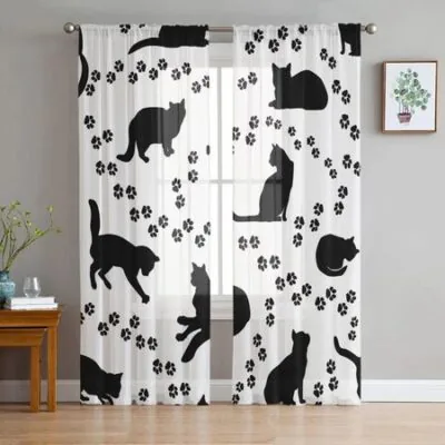 Cat Silhouette Footprints Black White Tulle Sheer Window Curtains for Living Room Bedroom Modern Voile Organza Curtains Drapes W135 x H115cm x1&Rod Pocket
