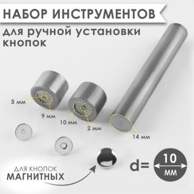 Комплект инструментов для установки магнитных кнопок из стали предназначен для точного и надежного крепления металлических застежек диаметром 10 мм.