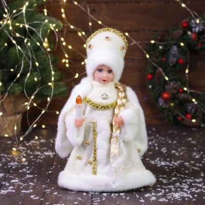 Новогодняя фигурка Снегурочки высотой 30 см с подсветкой и плавным движением создаёт особое настроение у ёлки. Украшенная бусинками и кокошником, она выполнена