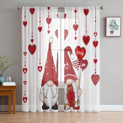 День святого Валентина Розовые розы Сердца Гномы Прозрачные шторы для гостиной Украшения Оконные занавески Кухня Тюль Вуаль Шторы W135 x H115cm x1Grommet Top