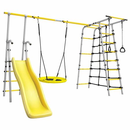 Спортивный комплекс подходит для установки на улице, например, на дачном участке. Разработан специально для детей от 3 лет. С помощью него дети развивают координацию, ловкость и силу, а также могут просто весело проводить время на свежем воздухе.Навесное оборудование устойчиво к атмосферному воздействию и в летнее время его можно не заносить в дом после игр.Устанавливается методом бетонирования.Габариты: 3572 × 2443 мм.Высота: 1855 мм.Максимальная нагрузка: 100 кг. Допустимая нагрузка на горку: 50 кг.Размеры горки: 1753 х 389 мм. Ширина ската с бортами — 410 мм. Внутренняя ширина — 290 мм.