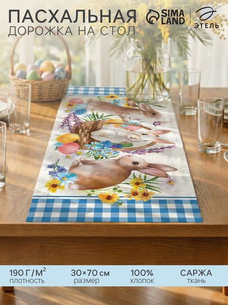 Эта пасхальная дорожка для стола создаёт праздничное настроение и уют. Изготовленная из плотного стопроцентного хлопка, она мягкая, приятная на ощупь и практичная в ежедневном использовании. Классический голубой фон с милым рисунком зайчиков делает её универсальным декором для весеннего торжества.ОсобенностиРазмер 30×70 см — оптимален для украшения праздничного стола или сервировки буфета.Плотная хлопковая саржа 190 г/м² хорошо держит форму, не мнётся и долго служит.Нежный пасхальный принт с зайцами создаёт атмосферу без лишних декоративных элементов.Лёгкий уход: машинная стирка при 40°C.Упакована в прозрачный пакет с крючком для удобного хранения и презентации в магазине.Почему она станет любимойДорожка добавляет завершающий акцент к пасхальной сервировке, защищая скатерть и задавая тон празднику. Гладкая хлопковая ткань безопасна для посуды и столовых приборов. Её можно использовать не только на Пасху, но и в течение всего года для создания весеннего настроения на кухне или в столовой. Это простой и элегантный способ сделать семейный обед по-настоящему праздничным.