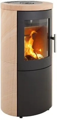 Дровяная печь ABX Aspen 5, черный, песчаник с верхней плитой имеет лаконичный дизайн в стиле модерн, цилиндрическую форму и компактные размеры, потому она отлично впишется в любое помещение. Благодаря мощности в 5кВт, она способна обогревать помещения, площадью до 50 м2. В качестве топлива используются брикеты или дрова, длиной не более 27 см.