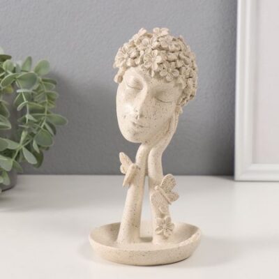 Фигурка — подставка для мелочей полистоун «Бюст. Девушка с цветами на голове», белый в крапинку, 9.5×9.5×18.5 см