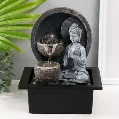Создайте островок спокойствия на своем столе. Настольный фонтан «Серый Будда» — это компактная медитативная композиция с мягкой подсветкой. Он объединяет стихию воды и образ Будды, чтобы привнести в ваше пространство гармонию и умиротворяющий звук текущей воды.Эффект живого водного потока: Струйка воды стекает по фактурной поверхности фонтана, создавая естественный и ненавязчивый звук. Этот монотонный шум помогает расслабиться, сконцентрироваться во время работы или создать фон для медитации.Мягкая атмосферная подсветка: Встроенные светодиоды деликатно подсвечивает композицию вечером. Свет делает игру воды еще более завораживающей и позволяет использовать фонтан как ночник, наполняющий комнату спокойной энергией.Символика для гармонизации пространства: Фигура Будды у фонтана — это не просто декор. Композиция соответствует принципам фэншуй, привлекая в дом позитивные потоки энергии «Ци». Она служит напоминанием о внутреннем равновесии и мудрости.Простота в использовании: Фонтан работает от стандартной сети 220В. Система с замкнутой циркуляцией воды — вы просто заливаете воду, и она движется по кругу. Компактные размеры позволяют разместить его на рабочем столе, полке или прикроватной тумбочке.Практическая польза и декор: «Серый Будда» решает сразу несколько задач: маскирует фоновые шумы, увлажняет воздух вокруг себя и служит стильным интерьерным акцентом. Это готовое решение для создания личного уголка релаксации в кабинете, гостиной или спальне. Подарите себе минуты тишины и созерцания.