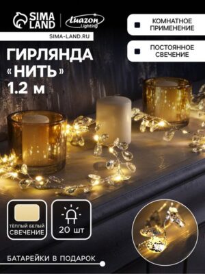 Гирлянда «Мишура» 1.2 м, роса с насадками «Кристаллы», IP20, серебристая нить, 20 LED, от батареек CR2032×2, свечение тёплое белое