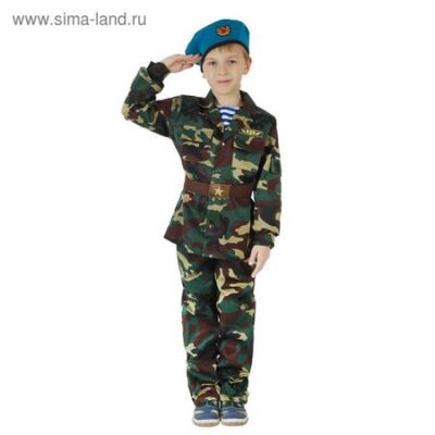 Карнавальный костюм «ВДВ», китель с манишкой, брюки, берет, ремень р. 38, рост 146 см подойдёт для любого военного праздника или театральной постановки, где ваш малыш исполнит роль отважного солдата! Дизайн комплекта максимально приближен к форме воздушно-десантных войск. А кто знает, может игра перерастёт в нечто большее, и «голубые береты» станут важной частью жизни юного героя?