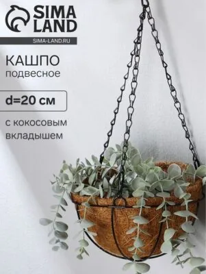 Подвесное кашпо станет отличным выбором для декорирования вашего сада или балкона. Оно гармонично сочетает в себе элегантность металлической формы полусферы и естественность кокосового вкладыша, создавая уют и живую атмосферу.ПреимуществаКомпактный размер, подходящий для различных декоративных композиций.Эко-материалы: конструкция из металла и кокосового волокна поддерживает здоровый микроклимат для растений.Лёгкое подвешивание: удобная установка, позволяющая размещать цветы на различных уровнях.Для кого это подходитПодойдет как для опытных цветоводов, так и для начинающих любителей природы. Стильное решение для тех, кто хочет привнести в свое пространство частичку натуральной красоты.Уход и использованиеИспользуется в закрытых помещениях и открытых пространствах в тёплое время года.Не оставлять на улице зимой для предотвращения повреждений.Отсутствие встроенной системы полива, за растением необходимо следить самостоятельно.ИтогЕсли вы в поисках простого и стильного способа украсить ваш дом или сад, это подвесное кашпо станет идеальным вариантом. Добавьте зелёные акценты в интерьеры и ландшафт вашего пространства.