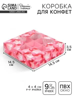 Главная » Все для дома Коробка для конфет, кондитерская упаковка, 9 ячеек, «Сладости», 14.7×14.7×3.5 см Просмотров 1 Размер одной ячейки: 4 х 4 см Дарите Счастье