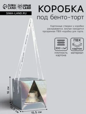 Представляем вам изысканную серебряную коробку для бенто-торта – идеальное сочетание стиля, качества и оригинального дизайна!Размер коробки 15,5 х 15,5 х 16 см позволяет аккуратно разместить внутри даже самый сложный и многослойный десерт, сохранив его первозданный вид.Изготовлена коробка из прочного и долговечного материала – ПВХ, что гарантирует надежную защиту вашего торта от механических повреждений и воздействия окружающей среды. Серебристый цвет придает упаковке благородство и элегантность, делая её подходящей для самых важных событий и праздников.Особенность этой коробки заключается в том, что её картонные боковинки открываются, словно лепестки цветка, предоставляя легкий доступ к содержимому и добавляя процессу распаковки элементы интриги и восторга. Такое нестандартное решение подчеркивает уникальность вашего подарка и создает атмосферу настоящего торжества.Серебряная коробка станет идеальным выбором для тех, кто стремится удивить и порадовать своих близких, коллег или партнеров. Она одинаково хорошо подойдет как для личного подарка, так и для корпоративных мероприятий, где важно подчеркнуть статус и значимость события.