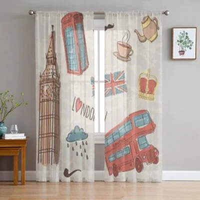 Красочные прозрачные шторы с символами Лондона для гостиной, прозрачные тюлевые занавески для окон, спальни, кухни, домашний декор, вуаль, шторы 135W x 114H(cm)