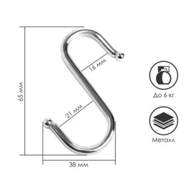 Крючок S-образный, d=4 мм, L=6.5 см, цвет хром